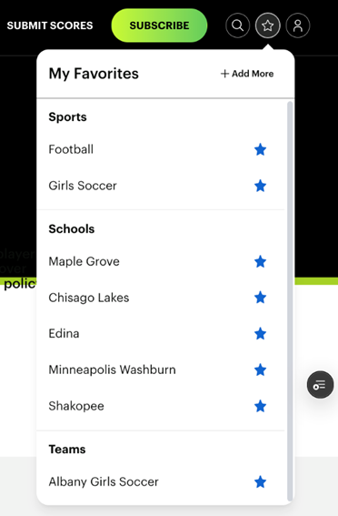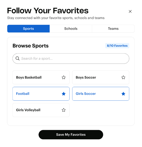 If you already have an account and are logged in, you can follow sports, schools, and teams from the ‘star’ icon on the top navigation bar. This opens up a ‘My Favorites’ menu.